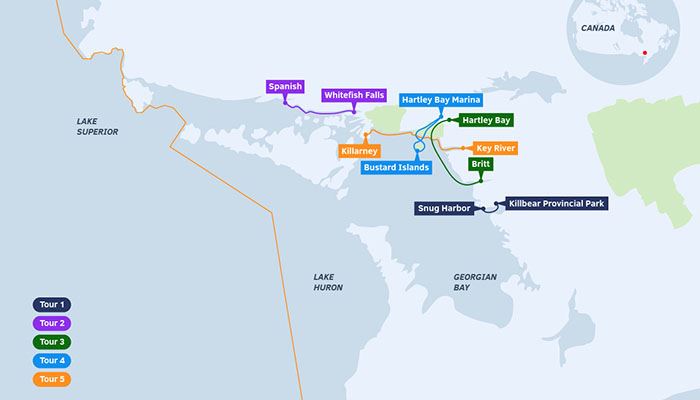 The North Channel trip begins at the town of Spanish, west of Sudbury. With the prevailing wind behind us we'll follow the northern shore, island hopping and exploring the least populated side of the channel. As your confidence grows you'll venture out into open waters, playing in the waves and swells.